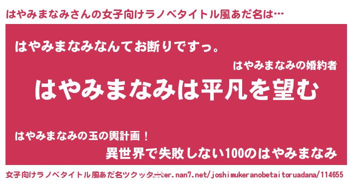 | 男性向けラノベタイトル風あだ名 | 『ダンジョンにはやみまなみを求めるのは間違っているだろうか』 |