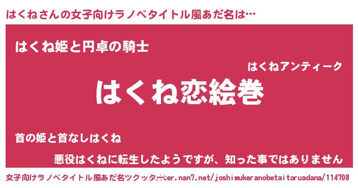 | 男性向けラノベタイトル風あだ名 | 『おまえをオタクにしてやるから、俺をはくねにしてくれ! 』 |