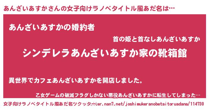 | 男性向けラノベタイトル風あだ名 | 『冴えないあんざいあすかの育てかた』 |