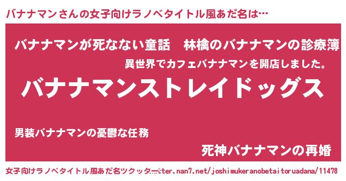 バナナマンさんの女子向けラノベタイトル風あだ名は… 『バナナマンストレイドッグス』『バナナマンが死なない童話 林檎のバナナマンの診療簿』『死神バナナマンの再婚』 ツクッター #女子向けラノベタイトル風あだ名ツクッター http://tkutter.nan7.net/joshimukeranobetaitoruadana/11478/