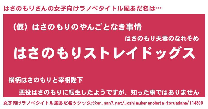 | 男性向けラノベタイトル風あだ名 | 『Re:はさのもりから始める異世界生活』 |
