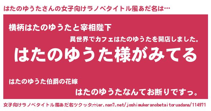 はたのゆうたさんの女子向けラノベタイトル風あだ名は… 『はたのゆうた様がみてる』『横柄はたのゆうたと宰相陛下』『はたのゆうたなんてお断りですっ。』 ツクッター #女子向けラノベタイトル風あだ名ツクッター http://tkutter.nan7.net/joshimukeranobetaitoruadana/114971/