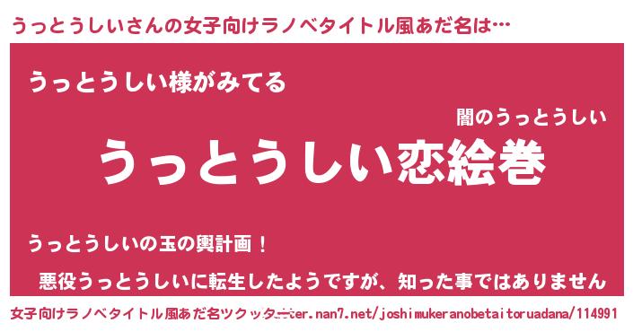 | 男性向けラノベタイトル風あだ名 | 『おまえをオタクにしてやるから、俺をうっとうしいにしてくれ! 』 |