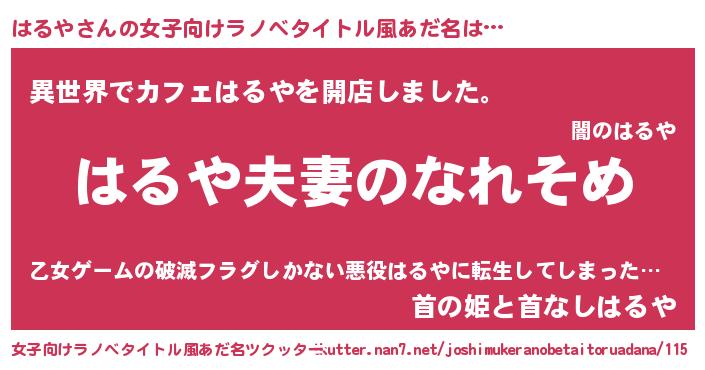 | 男性向けラノベタイトル風あだ名 | 『おまえをオタクにしてやるから、俺をはるやにしてくれ! 』 |