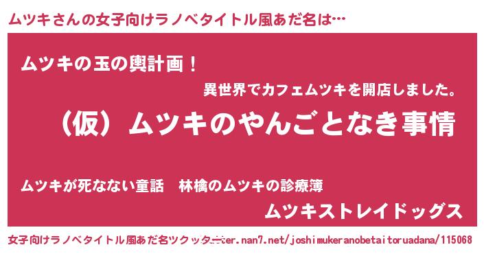 | 男性向けラノベタイトル風あだ名 | 『ムツキの憂鬱』『魔弾の王とムツキ』 |