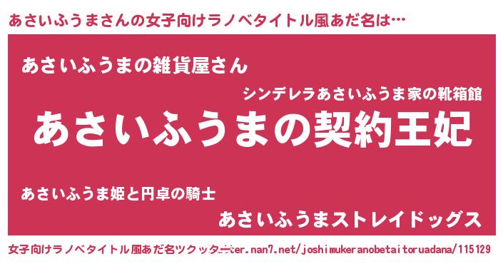 | 男性向けラノベタイトル風あだ名 | 『あさいふうまという概念が存在しない退屈な世界 』 |
