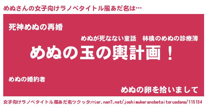 | 男性向けラノベタイトル風あだ名 | 『めぬ~年齢イコール彼女いない歴の魔法使い~』 |