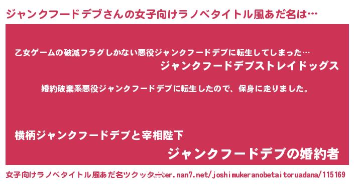 | 男性向けラノベタイトル風あだ名 | 『ジャンクフードデブスレイヤー』 |
