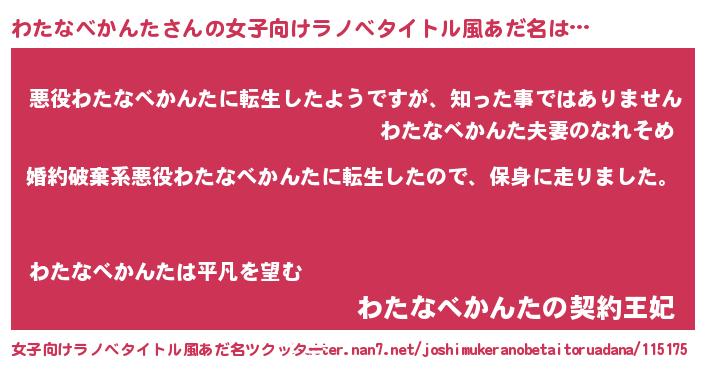 | 男性向けラノベタイトル風あだ名 | 『転生したらわたなべかんただった件』 |