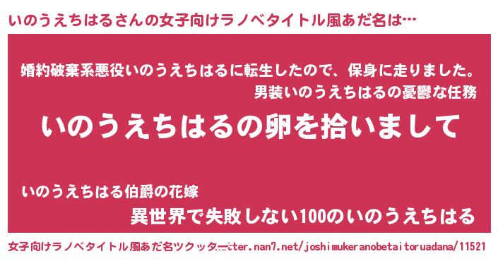 | 男性向けラノベタイトル風あだ名 | 『ダンジョンにいのうえちはるを求めるのは間違っているだろうか』 |