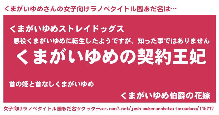 | 男性向けラノベタイトル風あだ名 | 『くまがいゆめという概念が存在しない退屈な世界 』 |