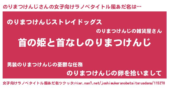 のりまつけんじさんの女子向けラノベタイトル風あだ名は… 『首の姫と首なしのりまつけんじ』『のりまつけんじストレイドッグス』『のりまつけんじの卵を拾いまして』 ツクッター #女子向けラノベタイトル風あだ名ツクッター http://tkutter.nan7.net/joshimukeranobetaitoruadana/115270/