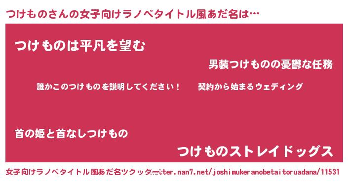 つけものさんの女子向けラノベタイトル風あだ名は… 『誰かこのつけものを説明してください! ~契約から始まるウェディング~』『つけものは平凡を望む』『つけものストレイドッグス』 ツクッター #女子向けラノベタイトル風あだ名ツクッター http://tkutter.nan7.net/joshimukeranobetaitoruadana/11531/