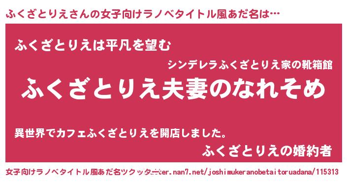 ふくざとりえさんの女子向けラノベタイトル風あだ名は… 『ふくざとりえ夫妻のなれそめ』『ふくざとりえは平凡を望む』『ふくざとりえの婚約者』 ツクッター #女子向けラノベタイトル風あだ名ツクッター http://tkutter.nan7.net/joshimukeranobetaitoruadana/115313/
