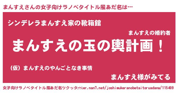 | 男性向けラノベタイトル風あだ名 | 『まんすえ~年齢イコール彼女いない歴の魔法使い~』 |