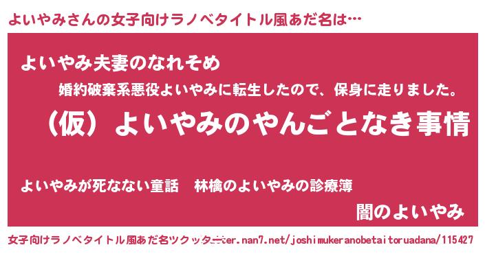 | 男性向けラノベタイトル風あだ名 | 『よいやみの憂鬱』『ヨイヤミスレイヤー』 |