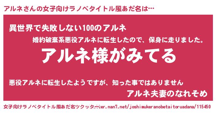 | 男性向けラノベタイトル風あだ名 | 『アルネの嫁は女の子じゃないと思った?』 |