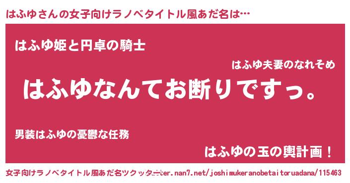 はふゆさんの女子向けラノベタイトル風あだ名は… 『はふゆなんてお断りですっ。』『はふゆ姫と円卓の騎士』『はふゆの玉の輿計画!』 ツクッター #女子向けラノベタイトル風あだ名ツクッター http://tkutter.nan7.net/joshimukeranobetaitoruadana/115463/