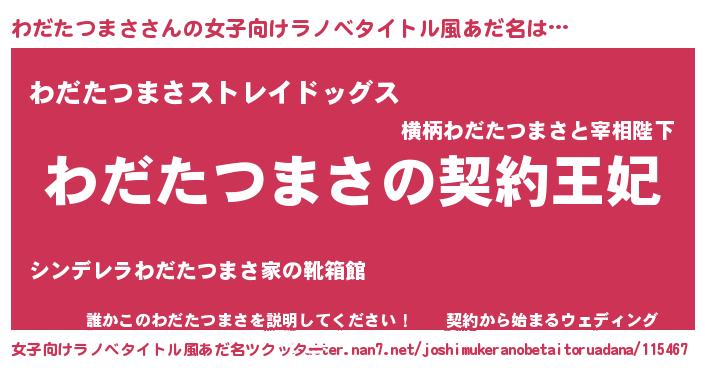 | 男性向けラノベタイトル風あだ名 | 『誰もが恐れるあのわだたつまさが、ぼくの専属メイドになるようです。』 |