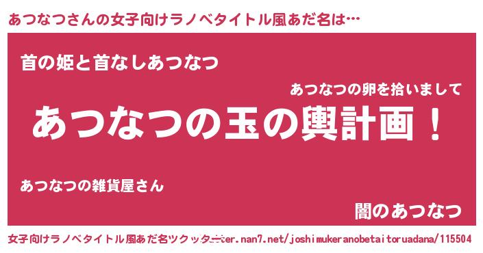 | 男性向けラノベタイトル風あだ名 | 『あつなつ~年齢イコール彼女いない歴の魔法使い~』 |