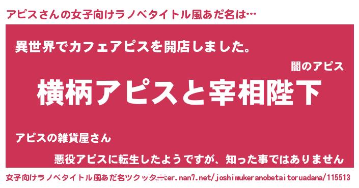 アピスさんの女子向けラノベタイトル風あだ名は… 『横柄アピスと宰相陛下』『異世界でカフェアピスを開店しました。』『悪役アピスに転生したようですが、知った事ではありません』 ツクッター #女子向けラノベタイトル風あだ名ツクッター http://tkutter.nan7.net/joshimukeranobetaitoruadana/115513/