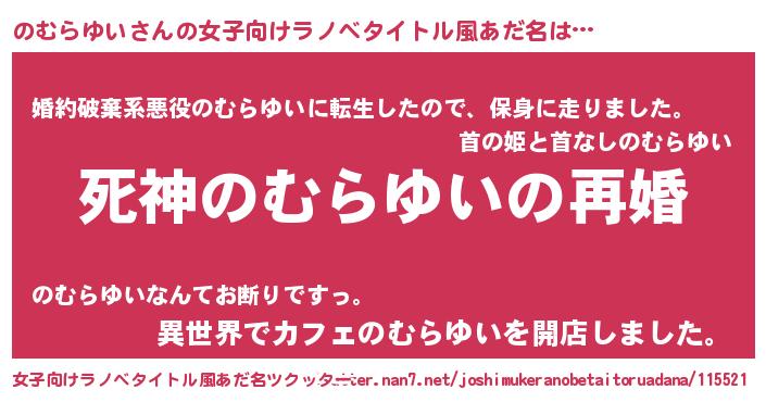 のむらゆいさんの女子向けラノベタイトル風あだ名は… 『死神のむらゆいの再婚』『婚約破棄系悪役のむらゆいに転生したので、保身に走りました。』『異世界でカフェのむらゆいを開店しました。』 ツクッター #女子向けラノベタイトル風あだ名ツクッター http://tkutter.nan7.net/joshimukeranobetaitoruadana/115521/