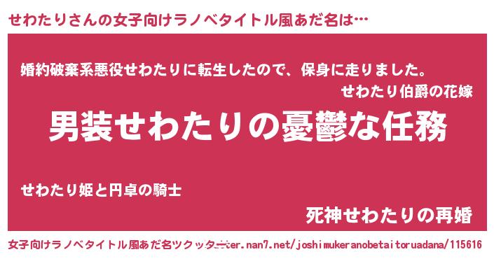 | 男性向けラノベタイトル風あだ名 | 『うちのせわたりが世界を掌握している!』 |