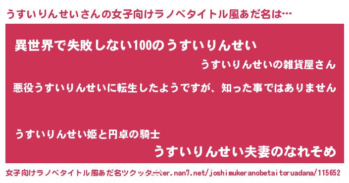 | 男性向けラノベタイトル風あだ名 | 『この素晴らしい世界にうすいりんせいを!』 |