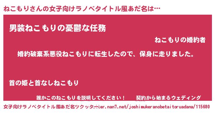 ねこもりさんの女子向けラノベタイトル風あだ名は… 『婚約破棄系悪役ねこもりに転生したので、保身に走りました。』『男装ねこもりの憂鬱な任務』『誰かこのねこもりを説明してください! ~契約から始まるウェディング~』 ツクッター #女子向けラノベタイトル風あだ名ツクッター http://tkutter.nan7.net/joshimukeranobetaitoruadana/115680/