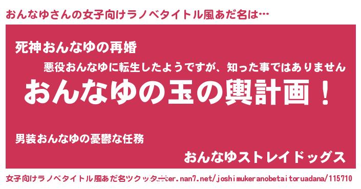 | 男性向けラノベタイトル風あだ名 | 『転生したらおんなゆだった件』 |