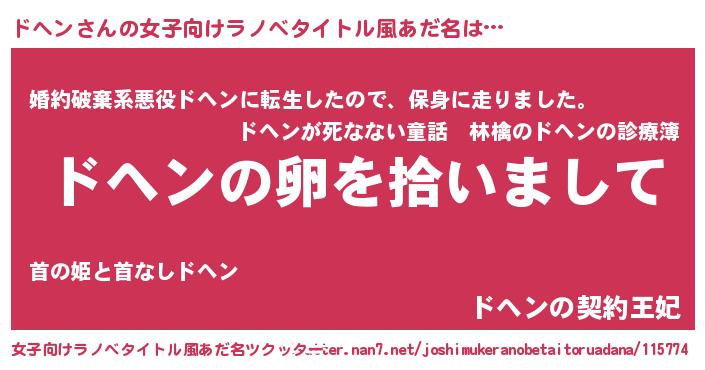 | 男性向けラノベタイトル風あだ名 | 『ドヘンの嫁は女の子じゃないと思った?』 |