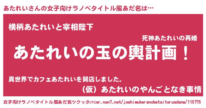 | 男性向けラノベタイトル風あだ名 | 『あたれい~年齢イコール彼女いない歴の魔法使い~』 |