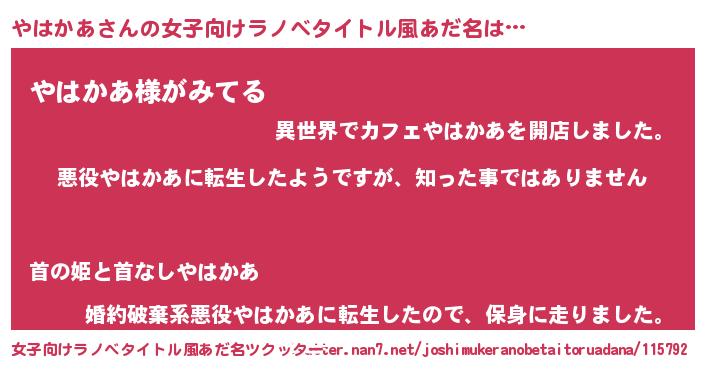 | 男性向けラノベタイトル風あだ名 | 『この素晴らしい世界にやはかあを!』 |