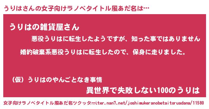 | 男性向けラノベタイトル風あだ名 | 『ウリハスレイヤー』『うりはの憂鬱』 |