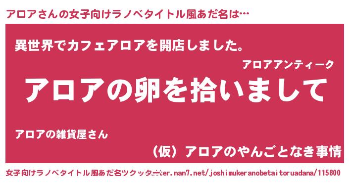 | 男性向けラノベタイトル風あだ名 | 『ダンジョンにアロアを求めるのは間違っているだろうか』 |