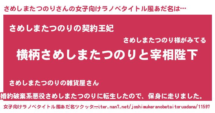 | 男性向けラノベタイトル風あだ名 | 『さめしまたつのりに滅ぼされるだけの簡単なお仕事です』 |