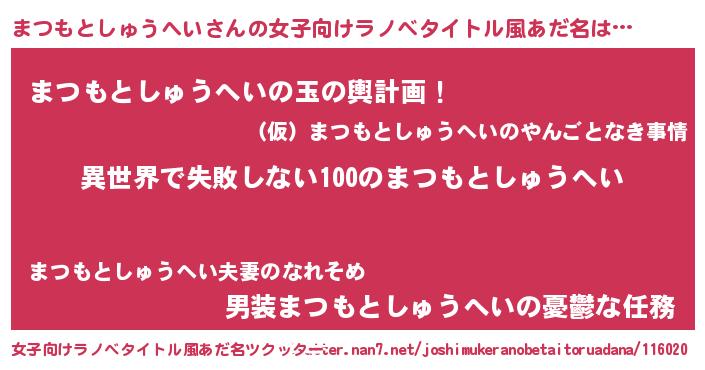 | 男性向けラノベタイトル風あだ名 | 『まつもとしゅうへいという概念が存在しない退屈な世界 』 |