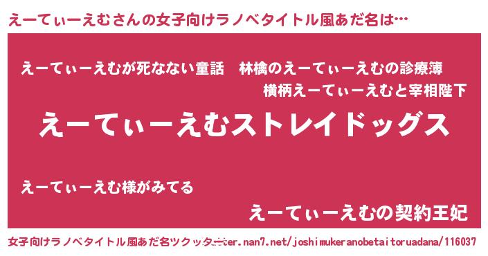 | 男性向けラノベタイトル風あだ名 | 『Re:えーてぃーえむから始める異世界生活』 |