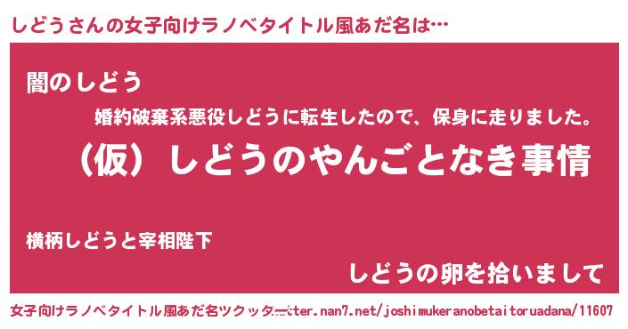 | 男性向けラノベタイトル風あだ名 | 『しどうの憂鬱』『シドウスレイヤー』 |