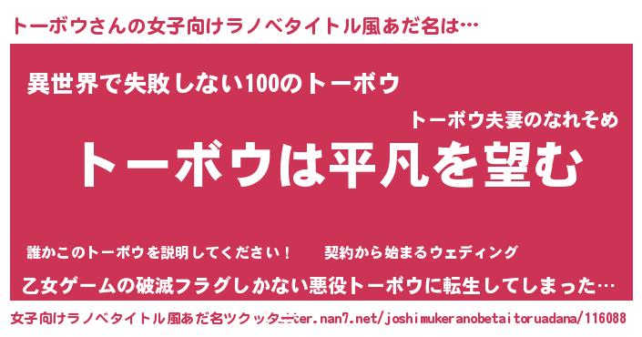 トーボウさんの女子向けラノベタイトル風あだ名は… 『トーボウは平凡を望む』『異世界で失敗しない100のトーボウ』『乙女ゲームの破滅フラグしかない悪役トーボウに転生してしまった…』 ツクッター #女子向けラノベタイトル風あだ名ツクッター http://tkutter.nan7.net/joshimukeranobetaitoruadana/116088/