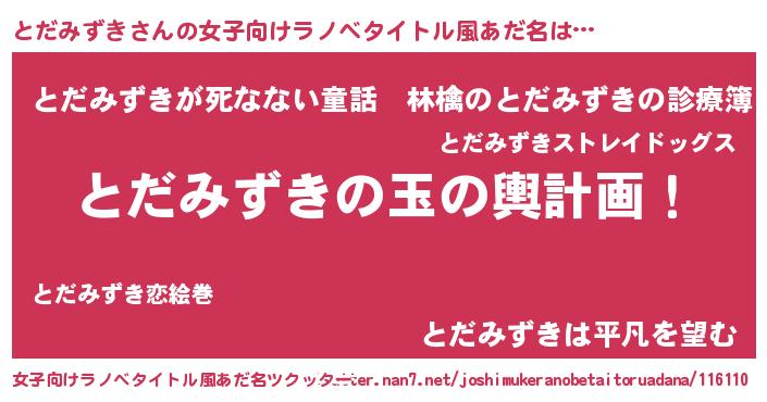 | 男性向けラノベタイトル風あだ名 | 『とだみずき~年齢イコール彼女いない歴の魔法使い~』 |