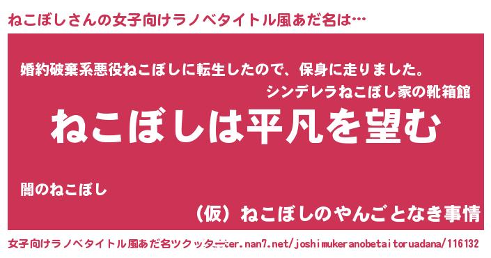 | 男性向けラノベタイトル風あだ名 | 『ダンジョンにねこぼしを求めるのは間違っているだろうか』 |