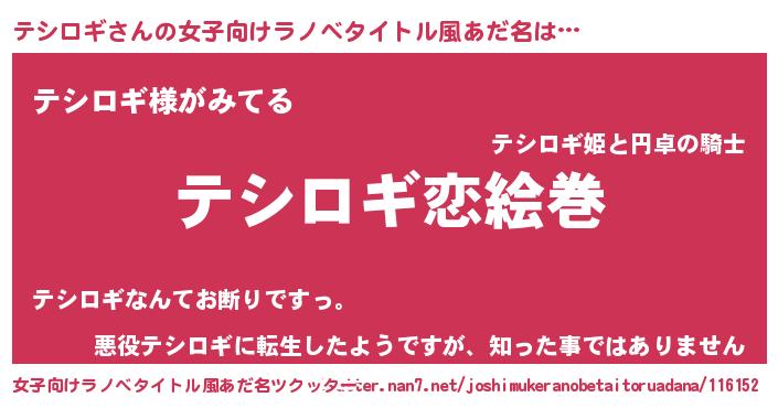 | 男性向けラノベタイトル風あだ名 | 『おまえをオタクにしてやるから、俺をテシロギにしてくれ! 』 |