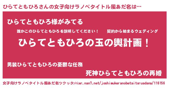 | 男性向けラノベタイトル風あだ名 | 『ひらてともひろ~年齢イコール彼女いない歴の魔法使い~』 |