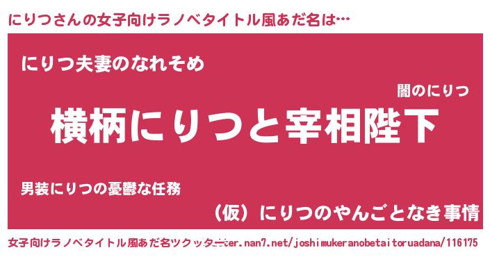 | 男性向けラノベタイトル風あだ名 | 『にりつに滅ぼされるだけの簡単なお仕事です』 |
