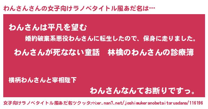 | 男性向けラノベタイトル風あだ名 | 『魔弾の王とわんさん』 |