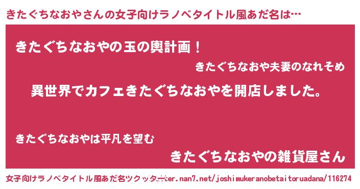 きたぐちなおやさんの女子向けラノベタイトル風あだ名は… 『異世界でカフェきたぐちなおやを開店しました。』『きたぐちなおやの玉の輿計画!』『きたぐちなおやの雑貨屋さん』 ツクッター #女子向けラノベタイトル風あだ名ツクッター http://tkutter.nan7.net/joshimukeranobetaitoruadana/116274/