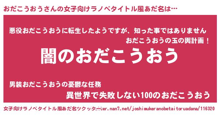 | 男性向けラノベタイトル風あだ名 | 『Re:おだこうおうから始める異世界生活』 |