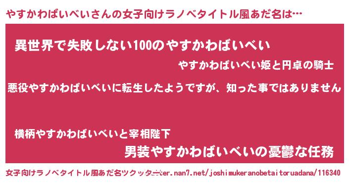 | 胡散臭い通販商品みたいなあだ名 | 『あなたにだけ特別に提供する100年もののヴィンテージワイン…その名も「やすかわばいべい」』 |