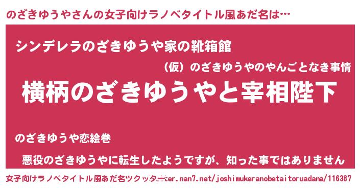 | 男性向けラノベタイトル風あだ名 | 『のざきゆうやに滅ぼされるだけの簡単なお仕事です』 |